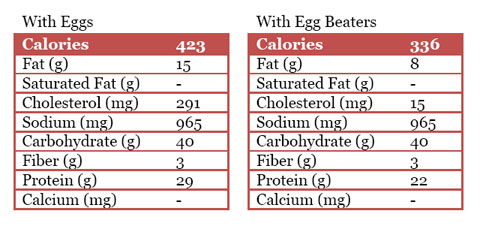 Using Egg Beaters lowers the fat and cholesterol.
